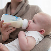 Mezclar en un vaso la leche en polvo y el agua, revuelva hasta eliminar las burbujas y espuma, luego vacíe la fórmula en la mamadera Dr. Browns. No agitar la mamadera en la preparación.