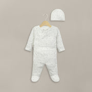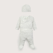 Conjunto de clínica 3 piezas; body con abertura en el centro, mitones en puño para tallas pequeñas. pantalones con pretina elasticada con patita y gorro.