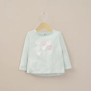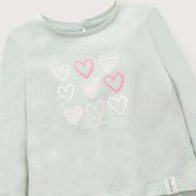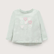 Polera básica de color menta, manga larga con el ruedo mas largo en la parte de atrás, abertura en la espalda con boton y con estampado central de corazones.
