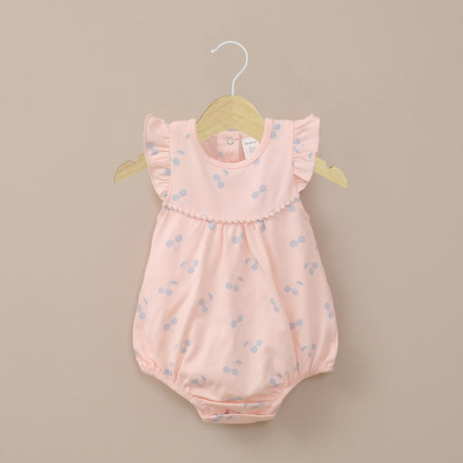 Bombacho con vuelitos en hombros, estampado de guindas en tonos pasteles, y broches reforzados en entrepiernas.