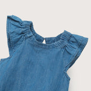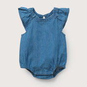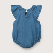 Bombacho de mezclilla, sin mangas y hombros con vuelitos, broches reforzados en entrepiernas.