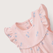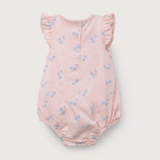 Bombacho con vuelitos en hombros, estampado de guindas en tonos pasteles, y broches reforzados en entrepiernas.