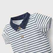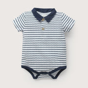 Body manga corta de bebé con estampado de rayas y cuello camisero, broches reforzados en entrepiernas y botones en centro delantero.