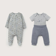Conjunto de 3 piezas; body manga corta, pantalón con cintura elastica doble y patitas. osito con cierre en la parte delantera y patitas. en tonos azules y celestes con lúdicos estampados de dino.