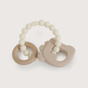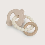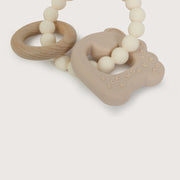 Mordedor de tres piezas con forma de osito, de colores azulados para niño. contiene dos piezas de silicona y una de madera. ideal para la etapa de dentición.