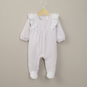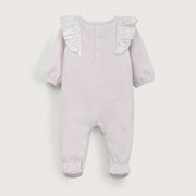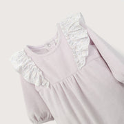 Osito de plush super suave de color lila con vuelitos estampado con tiernas florcitas en hombros. broches reforzados en espalda.