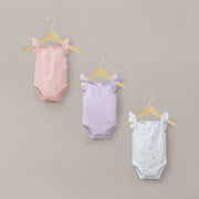 Tripack bodies tirantes vuelitos de bebé niña con estampados de winnie poh en tonos rosa y lila y broches reforzados en entrepiernas