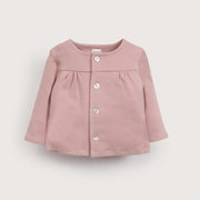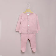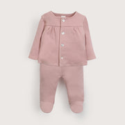 Conjunto de 2 piezas bebé niña en color rosa viejo, chaqueta tipo polerón con abertura frontal con botones, pantalón con cintura elastizada y patitas para recubrir los pies de tu bebé.