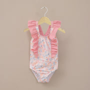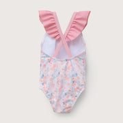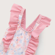 Traje de baño niña de color rosado con estampado de hojas tropicales en tonos rosados, damasco y lila, con espalda cruzada y vuelos en frente y espalda.