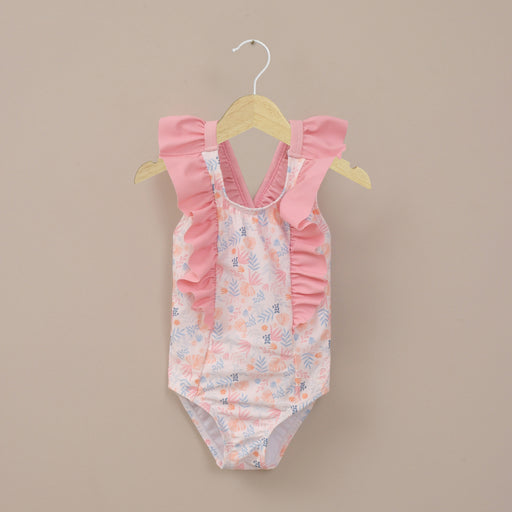 Traje de baño niña de color rosado con estampado de hojas tropicales en tonos rosados, damasco y lila, con espalda cruzada y vuelos en frente y esp...