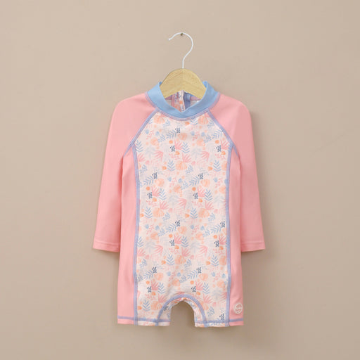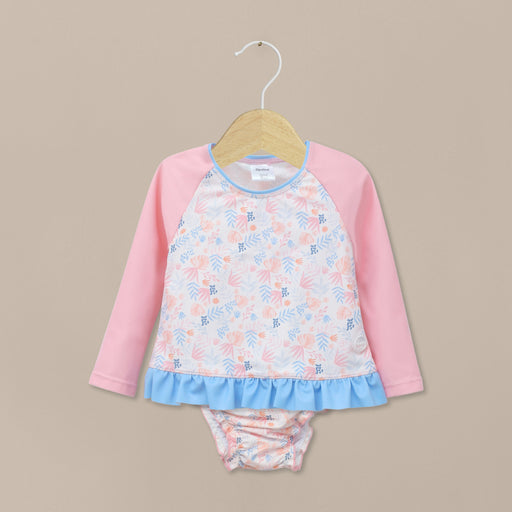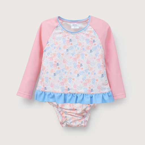 Traje de baño niña de dos piezas de color rosado con estampado de hojas tropicales en tonos rosados, damasco y lila. top manga larga con vuelo en e...