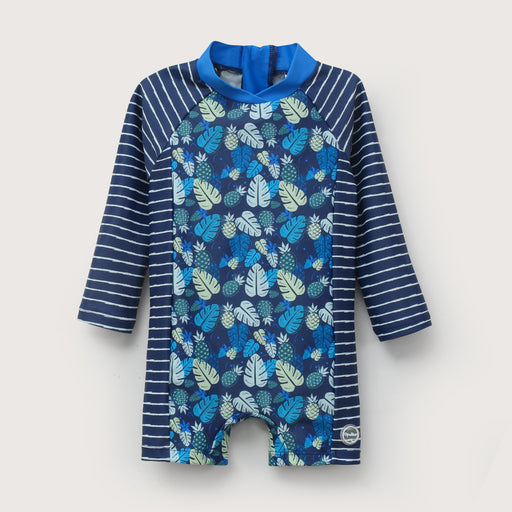 Traje de baño enterito de niño, con manga raglan. cierre en centro espalda. cuerpo con estampado playero. mangas rayado marinero.