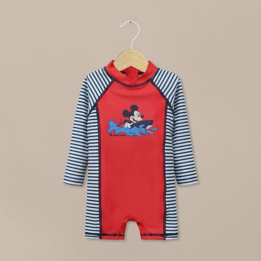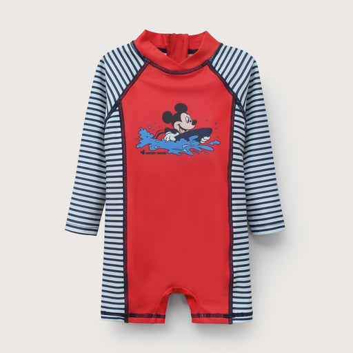 Traje de baño enterito disney de niño, con manga raglan. cierre en centro espalda. con estampado de mickey. mangas rayado marinero y cuerpo rojo.