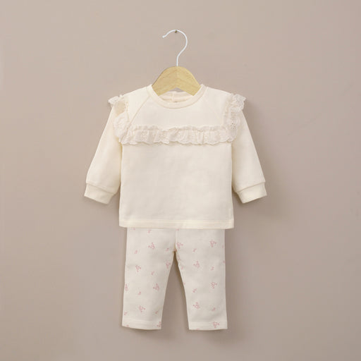 Conjunto de dos piezas; polerón con broderie en centro delantero y pantalón con estampado de flores.60% algodón 40% poliester
